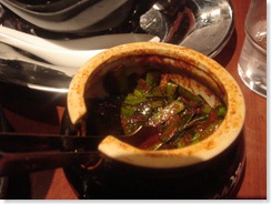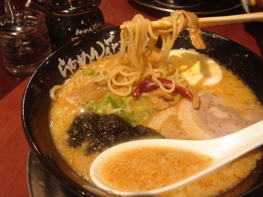 湯頭部份,觀察其日本官方的網站,它說明它們的湯頭基本上,水是特別強調的Ph質7.9,硬度2.7/l的軟水,混合以香菇為首的多種蔬菜為基底的湯頭,有趣的是,在日本還提供的鹹味與醬油的口味之湯頭,到了台灣,就主推豬骨加上述湯汁的九州口味,主要是豬的拳骨,混合大量的大蒜及豬背的精華油脂常時間熬煮,由於基底有香菇之類的蔬菜,加上長時間的熬煮,雖然號稱是大蒜豬骨拉麵,並不會有大蒜嗆人味與臭味,比起一般的日本吃的傳統的豬骨湯汁相比,濃而不厚,相當的有趣.