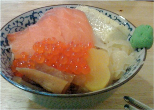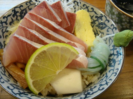 先說台灣的生魚片蓋飯常犯的問題,海鮮生魚片食材常常品質不穩定,不是生魚片不夠新鮮,生魚片吃在口中毫無鮮甜的味道,就是解凍有問題,吃到微微的冰渣,還有醬油的部分,台式的醬油比較死鹹,甜味較少,炒菜魯肉一流,但是碰到生魚片就是比不上日式醬油,因為日式醬油吃起來較偏甜;另外還有真正的日本生魚片蓋飯還要附上醃過的紅薑,味道有股濃烈的醋香氣,到日本當地的生魚片蓋飯專賣店一進門,除了飯香,就是這股醋香味道.