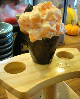 蝦卵手卷(50元)蝦卵相當的新鮮,彈Q,如果紫菜部分烤的脆一些會更好,不過還不錯吃.
