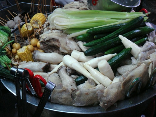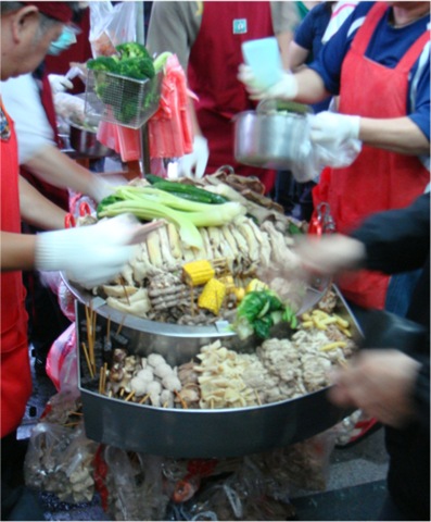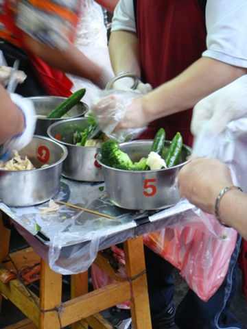 這個攤子用著不銹鋼臉盆推著賣,一大鐵鍋讓你挑選你喜歡吃的雞肉部位,選完了給你一個號碼,好幾個人幫忙剪肉,挑骨,還會問你要多辣,喜歡辣的人務比加辣,味道更是更上層樓.